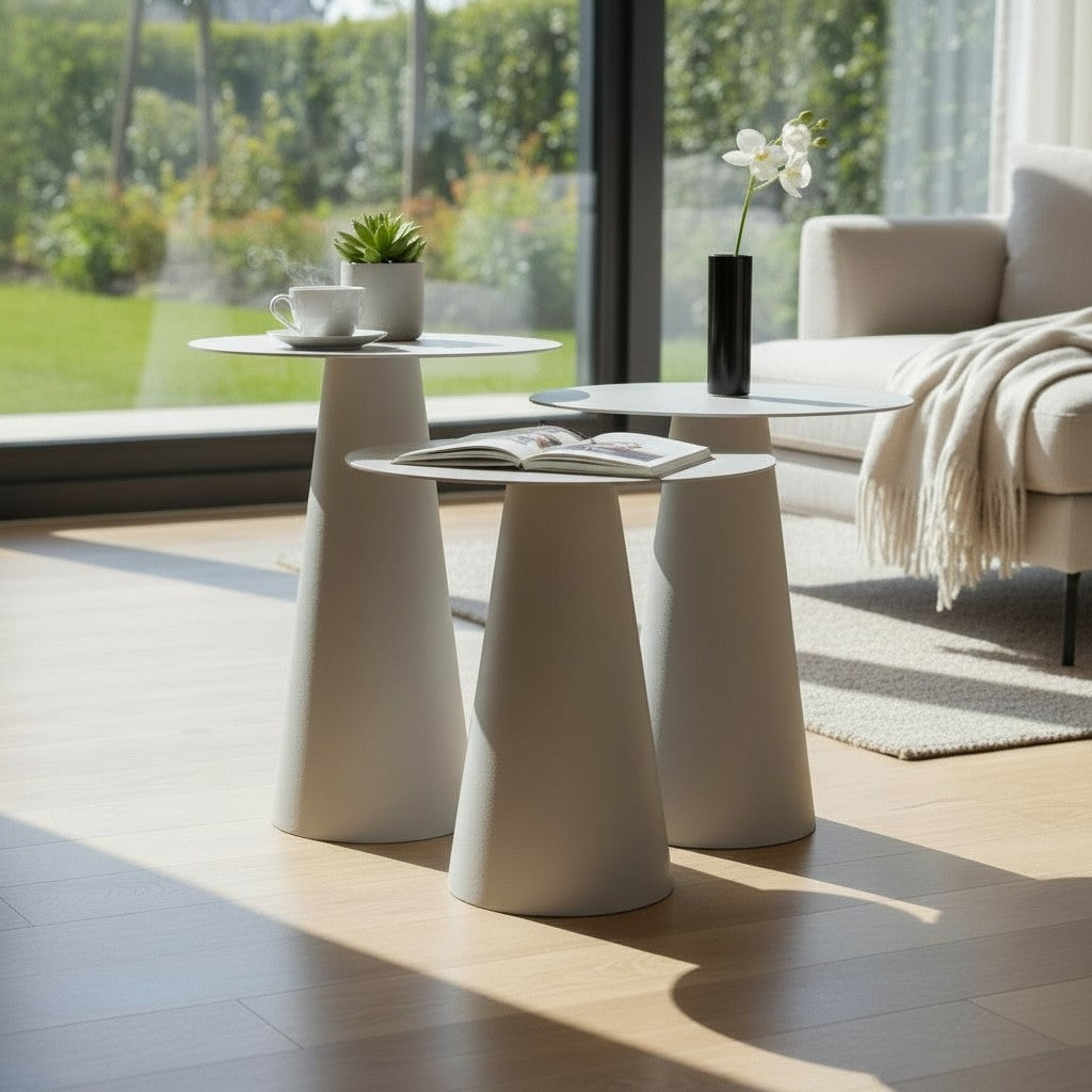 3 parçalı konik yan sehpa seti 🪑 minimalist tasarımı ve dikkat çekici renkleriyle — 🔴 Kırmızı, 🔵 Lacivert, ⚪ Beyaz — yaşam alanlarınıza zarafet getiriyor. Dayanıklı metal gövde ve pürüzsüz mat yüzeyiyle hem şık hem de uzun ömürlüdür. Oturma odası 🛋️, yatak odası 🛏️ veya ofis 💼 gibi her ortamda mükemmel uyum sağlar.
